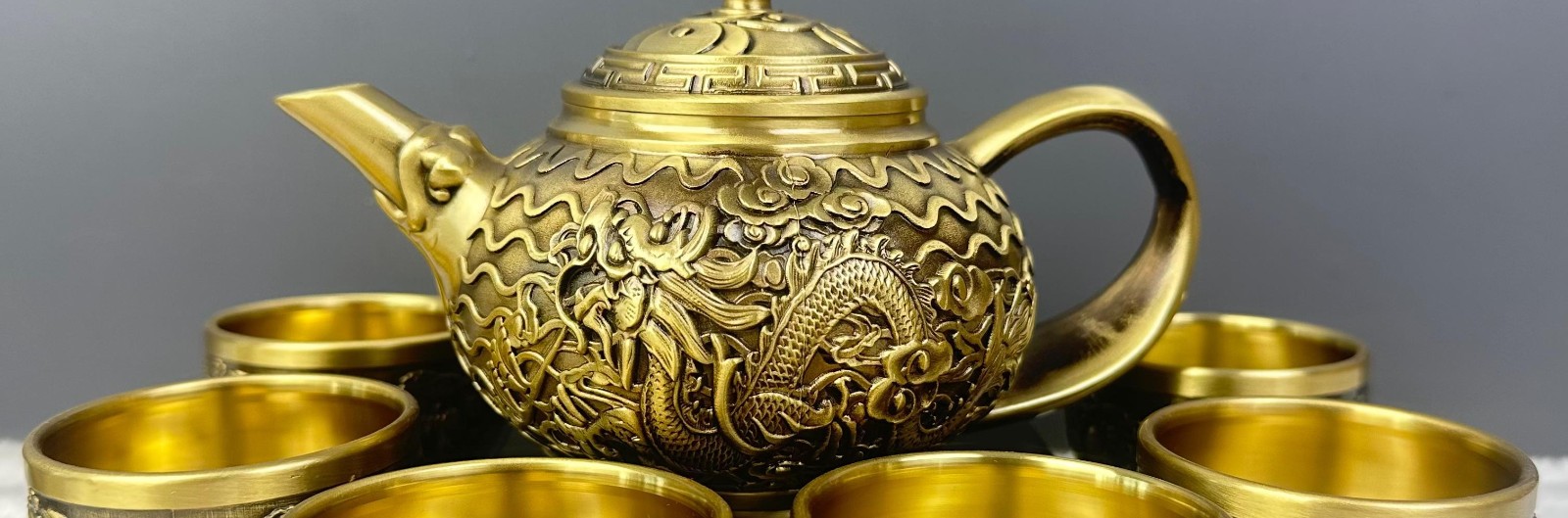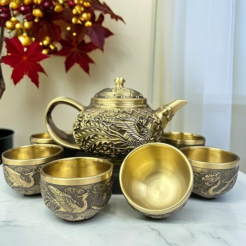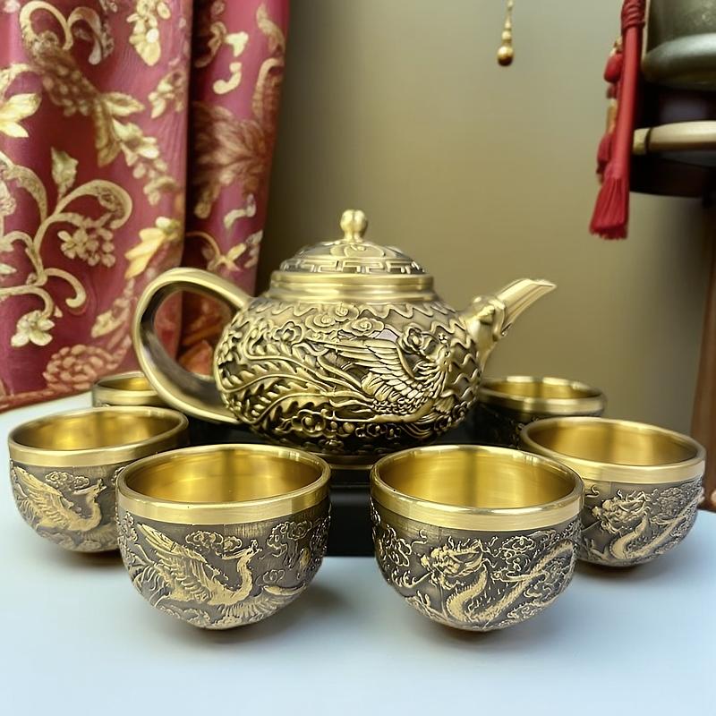 12分鐘前新款套裝【一壺八杯】中式浮雕黃銅龍鳳壺復古大容量龍嘴壺擺件 - 純黃銅茶具 龍鳳5件組【1茶壺4杯1托盤】-NT$1698